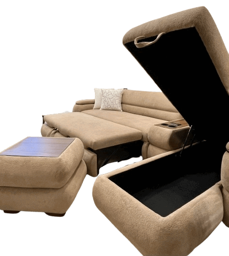 ركنه مودرن كافيه تتكون من 2كنبه واحده كنبه سرير والاخري بسحارة وحامل شاي يتوسطهما وبوف